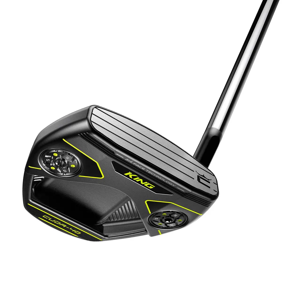 The KING Cuda putter features an oversized mallet shape available in either a single bend or slant neck hosel. The single bend has 0 degrees of toe hang and is best situated for a player with a straight back and straight through putter stroke. While the slant neck has 40 degrees of toe hang and is suited for those putting strokes with a moderate arc in them.